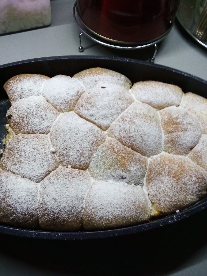 Necháme vychladnout, na talíři buchty pocukrujeme moučkovým cukrem.