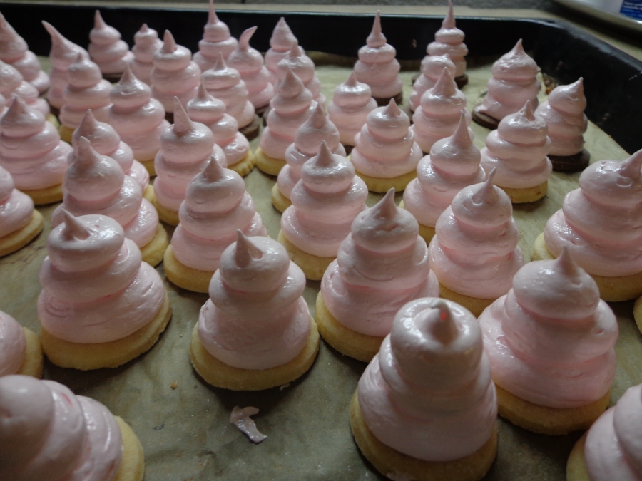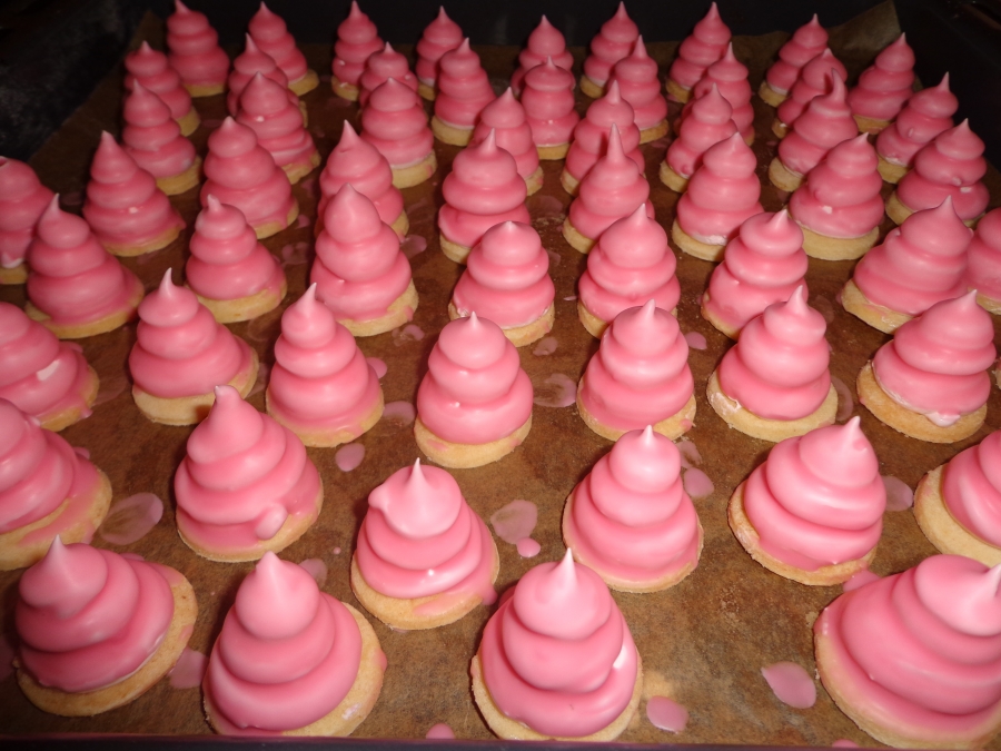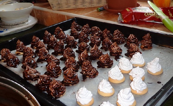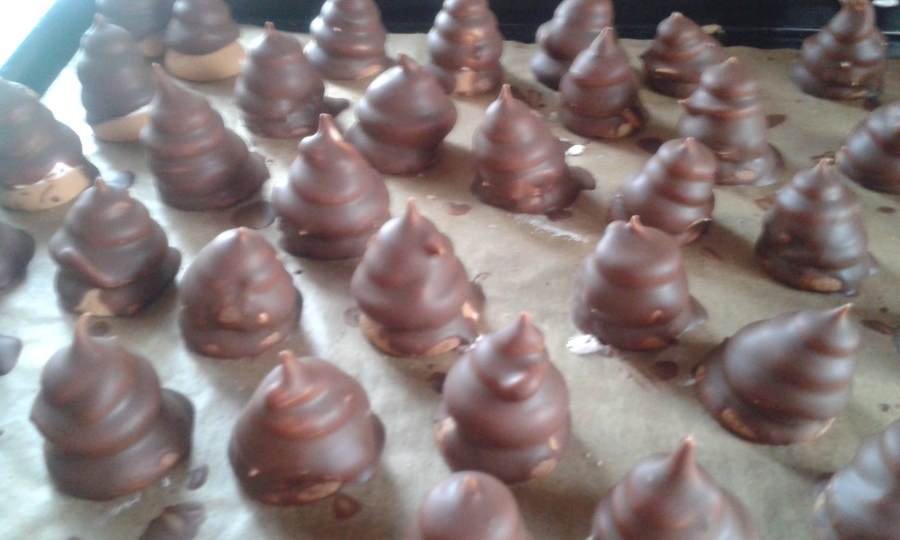 2. Vzniklou hmotu naplníme do čistého cukrářského sáčku s ozdobnou trubičkou a stříkáme na piškoty. Můžeme použít i upečená linecká kolečka.Dáme sušit do trouby velmi pomalu a jen chvilku aby se sníh zatáhl a nebortil lépe se pak máčí v čokoládě.