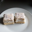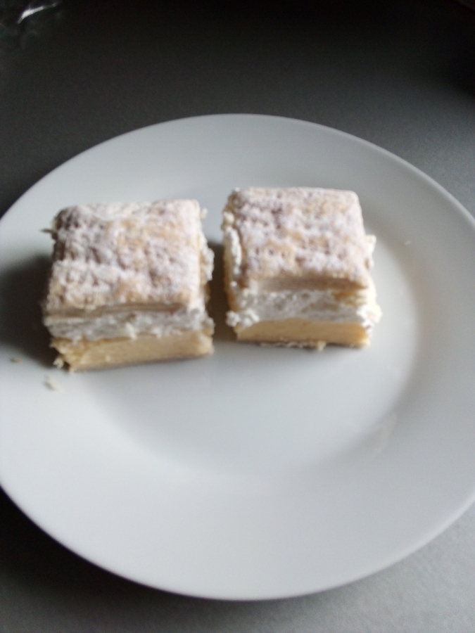 První plát potřeme nejprve vanilkovým krémem, poté šlehačkou, a navrch naskládáme upečené čtverce. (Tímto způsobem se nám bude moučník dobře krájet. Je to jednodušší varianta pro začátečníky, poněvadž pokud je i vrchní vrstva upečená vcelku, krájení jde hůře - nemáme-li vhodný nůž, těsto do měkké šlehačky a krému prolamuje a drobí.) Poté vykrajujeme kostky, sypeme moučkovým cukrem