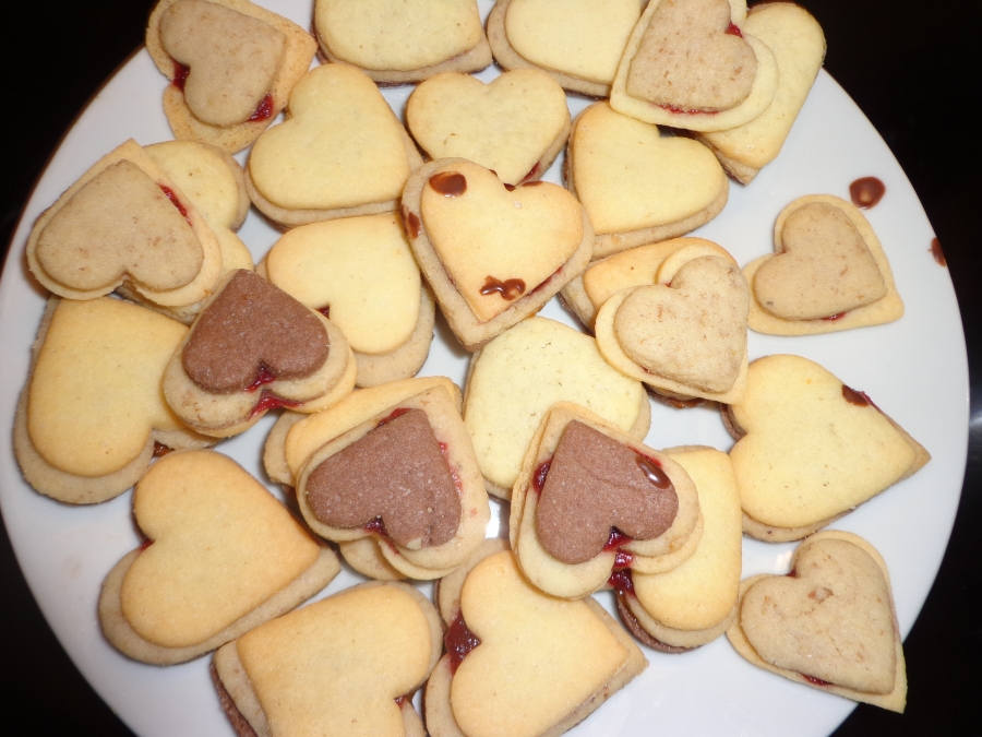 Ze všech těst vykrajujeme kolečka a upečeme je. Kolečka slepujeme krémem, vždy jedno kakaové, jedno oříškové a jedno bílé, navrch zdobíme čokoládou a oříškem.