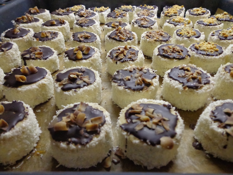Z těsta vykrajujeme kolečka a upečeme po vychladnutí slepujeme po 3 krémem, mažeme i okolo a obalíme v kokosu,(já mám raději v mleté ořechy) Horní kolečko potřeme čokoládou a bílou,malujeme macešku.