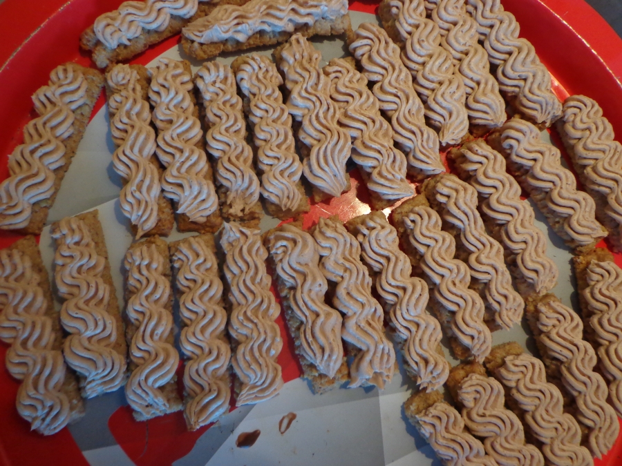 Rohlíčky rozložíme na plech s pečicím papírem, nastříkáme krémem, necháme ztuhnout v ledničce a nakonec potahujeme čokoládou na vaření, ve které jsme rozpustili kousek 100% tuku.