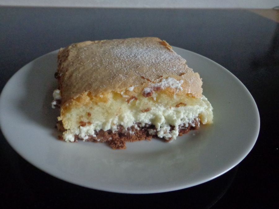2. těsto: šleháme vejce s cukrem do "běla". Potom přidáváme po troškách olej a vodu. Nakonec opatrně vmícháme mouku s práškem do pečiva. Toto těsto nalijeme na tvarohovou náplň a pečeme v troubě asi na 160 °C cca 45-50 minut.